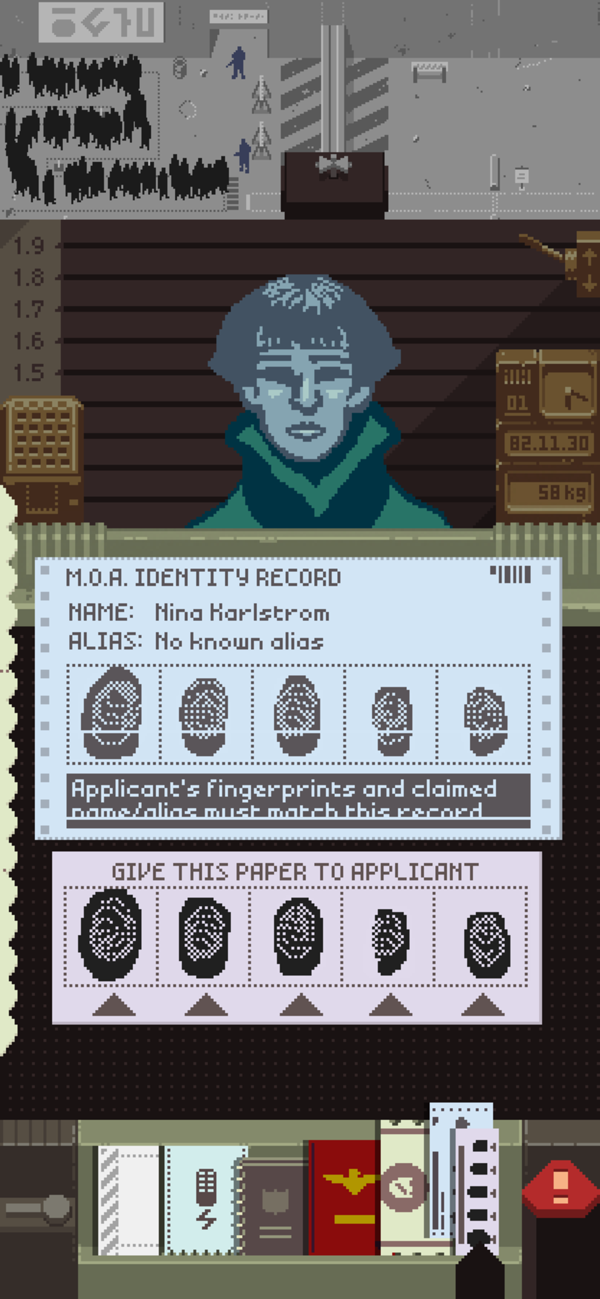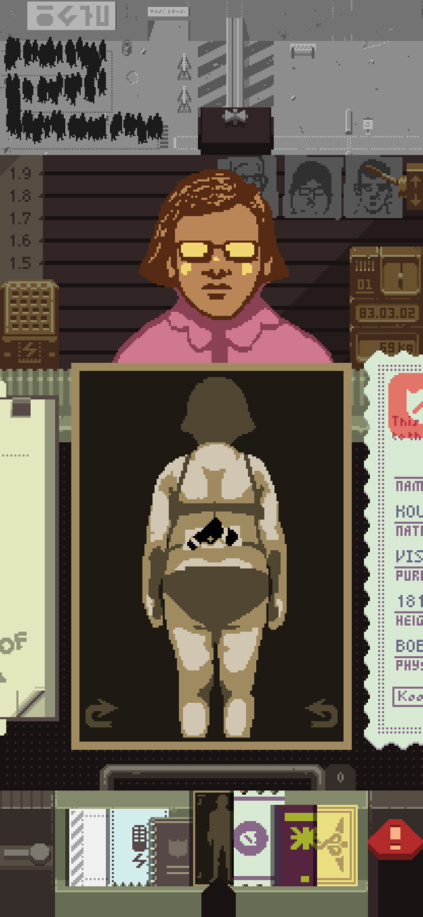 到了中期游戏的难度开始提升,在遭受了很多次恐怖袭击后需要审查证件也随之增多。此时证件为护照、通关文件、身份信息采集卡和一个诡异的看不懂的文件以及工作证(如果有的话)