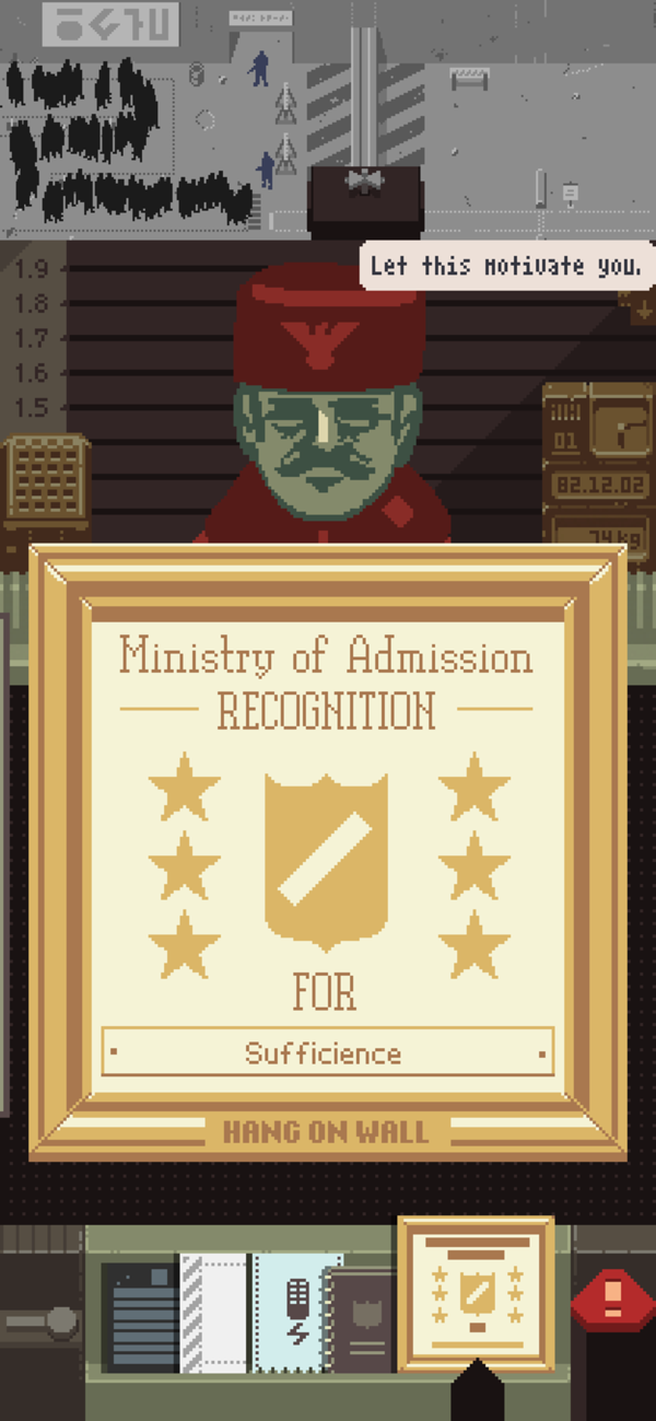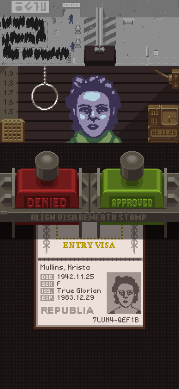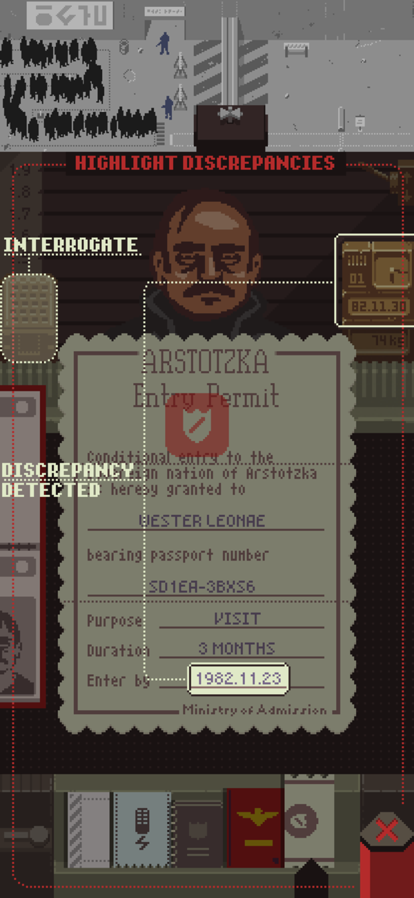 游戏前期的难度并不大,这一阶段可以说主要是让玩家熟悉审查工作的流程。此时最多的话最多只有三个证件,护照、通关文件以及工作证。
