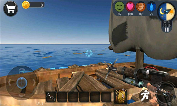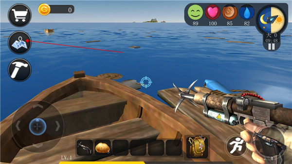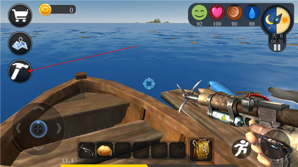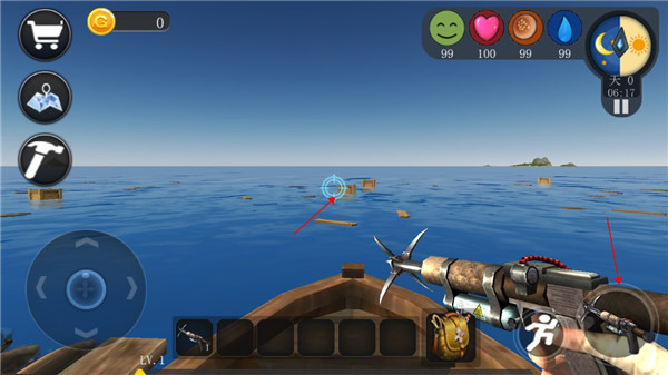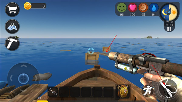 1、游戏开始玩家会出现在一条小船上,通过手中的标枪来获取物资,把准星对准木箱或浮木,长按右下角的图标发射。