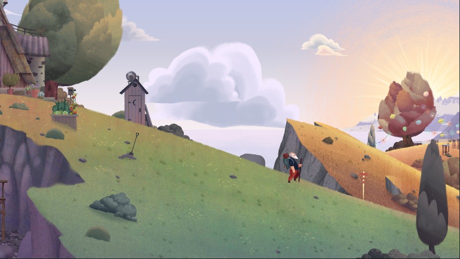 3、移动到椅子前:直接点击远方的房子,老人会自动寻路,跳过各个山谷,走到房子前的椅子上坐下。