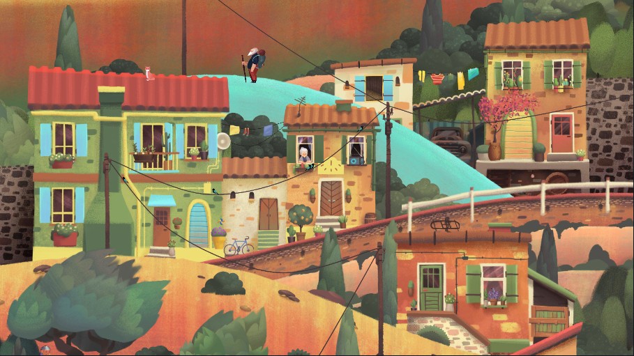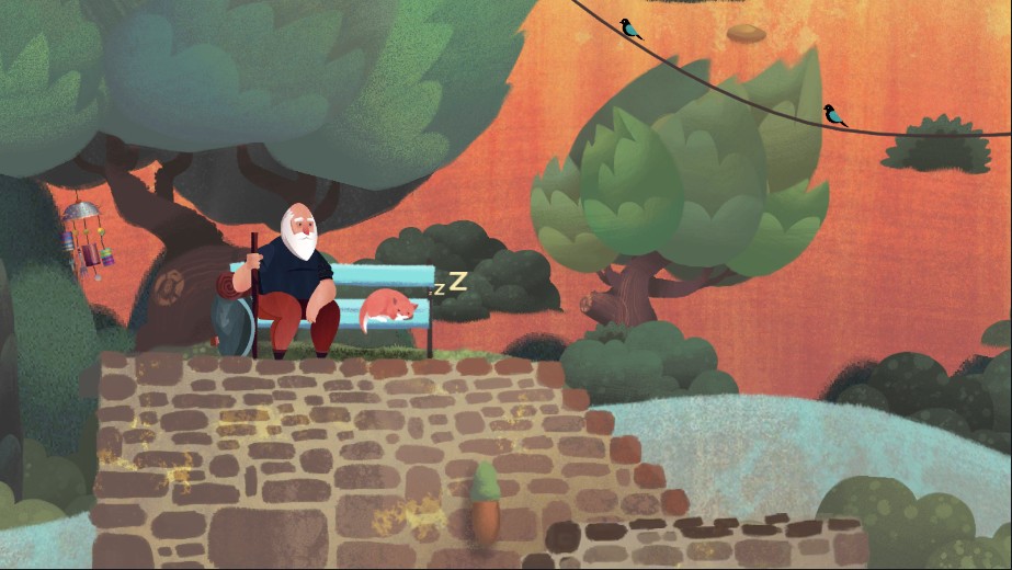 3、触发剧情:点击睡觉的懒猫,猫就会惊醒,然后跳到前面的房顶上,老人也会起身准备继续前进。
