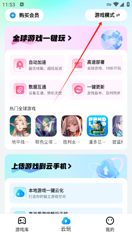 1、这里点击云玩,然后选择右上角的游戏模式进行切换即可