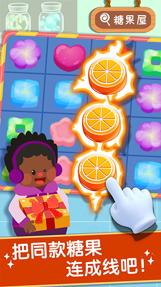 买点糖果解解腻。红的黄的绿的,好多糖果。打包糖果的秘诀是:一笔连出3颗及以上的同款糖果,怎样才能更快打包?仔细思考哦。