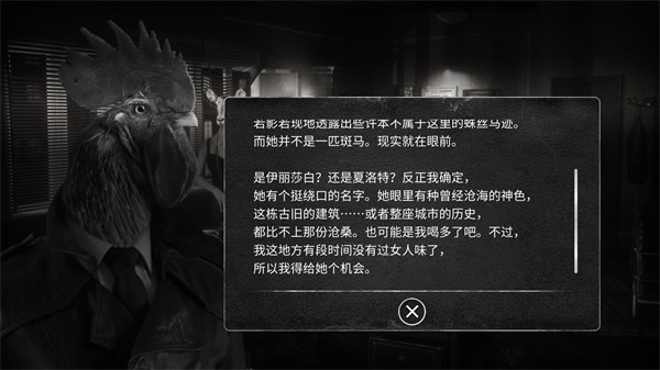 公鸡神探是一款剧情互动解谜类游戏,玩家在游戏中将化身公鸡神探,需要通过各种npc进行对话、对各个场景进行探索等方式来获得线索,玩家还需对这些线索进行解密和排序来让自己不断的朝着真相靠近。游戏采用非常离奇的视觉黑白小说画风,包含了超多的故事剧情,玩家在游戏中的每次选择都将影响着故事的走向,多样的结局也为玩家带来更多的游戏感受。
