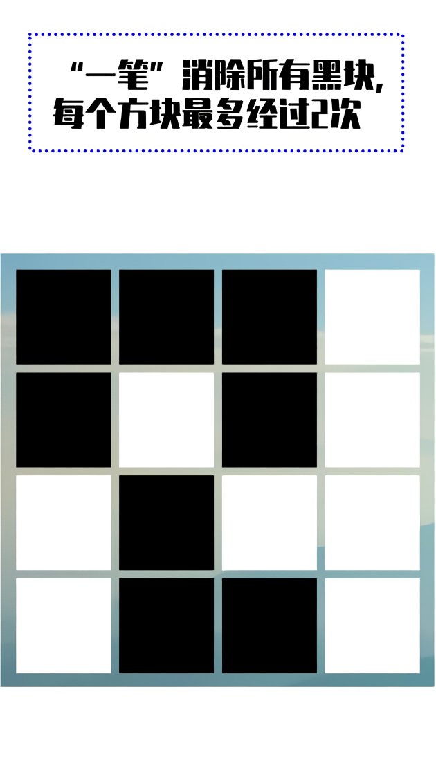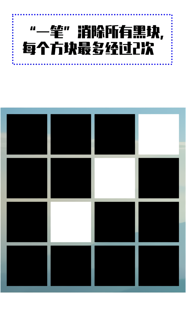 1、《一笔消》结合 “一笔画”和 “消除” ,将两者合为一体,只需要一笔消除所有黑色方块即可过关。
