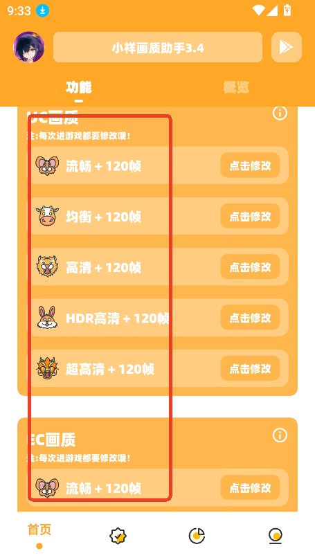 1、进入小祥画质助手app首页,选择需要的画质,点击修改