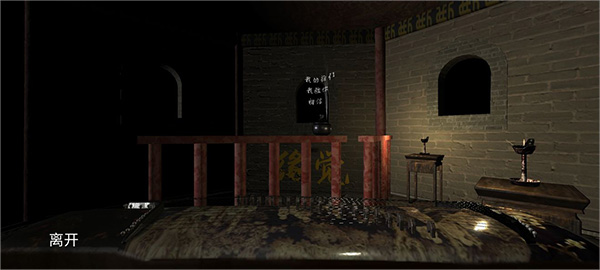 点击两次椅子,触发观音像,点亮牌匾上方右侧数第三个佛字,点击牌匾,露出钥匙。