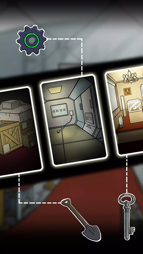 左边门把手,可卸下,装到正对面门上,打开得铁锹,花盆里挖出蓝色齿轮,装到右边门上,将蓝色和绿色位置对换,打开门,从箱子里取出相应物品。