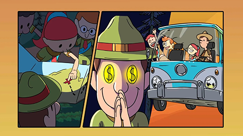 这是一款寻宝游戏,具有独特的卡通手绘风格,讲述了一群小童子军的故事。