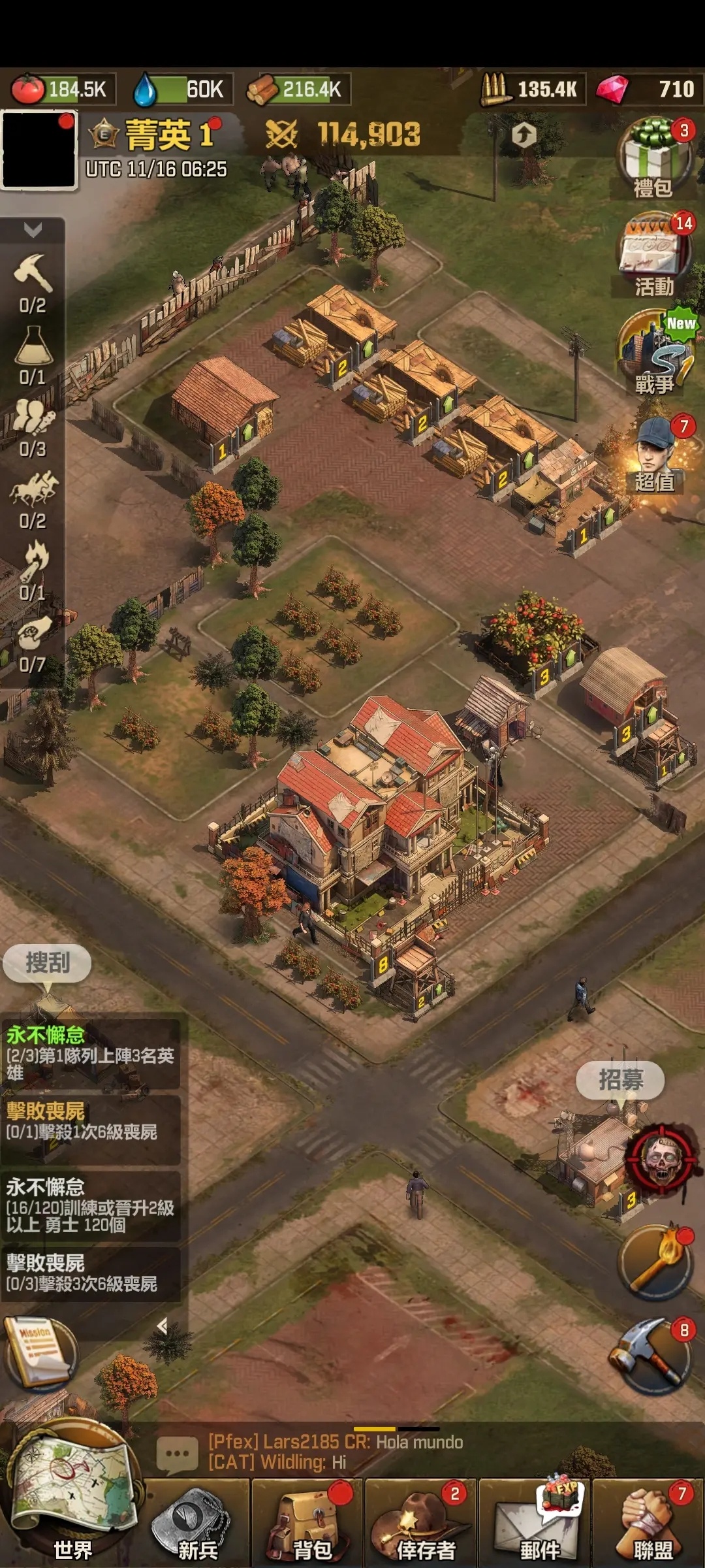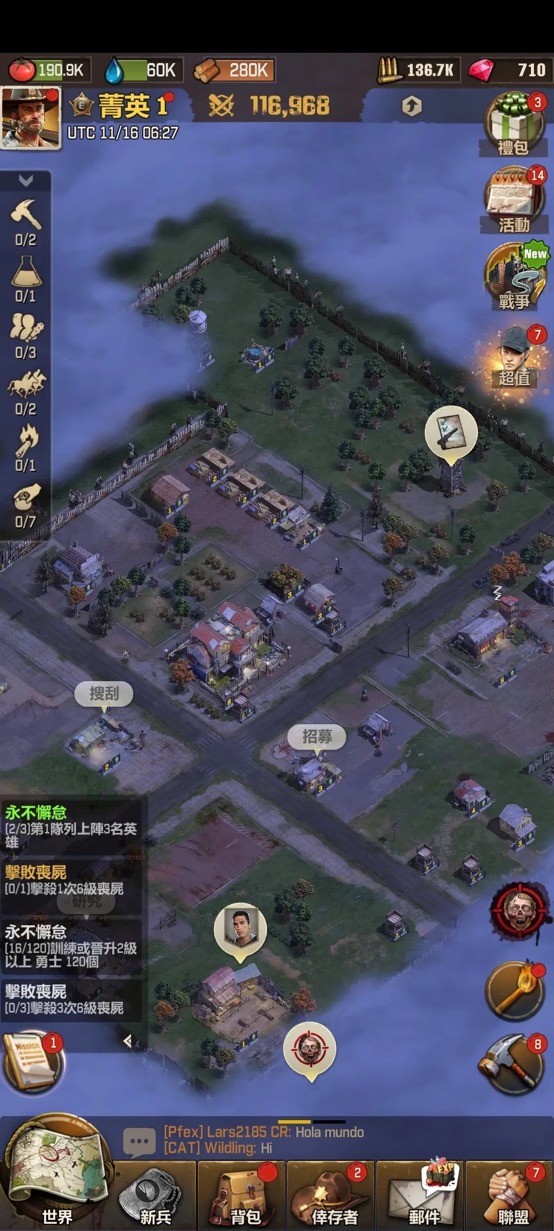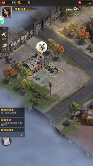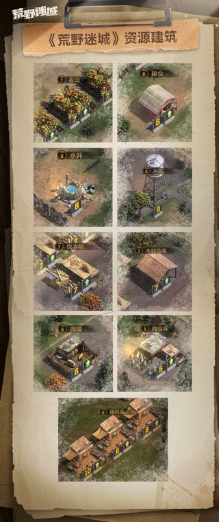 1、在重建希望镇的过程中,你将逐步修复【农场、水井、伐木场、屠宰场、弹药库】等五大资源生产设施,分别生产【食物、清水、木材、肉类、弹药】。