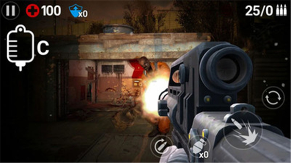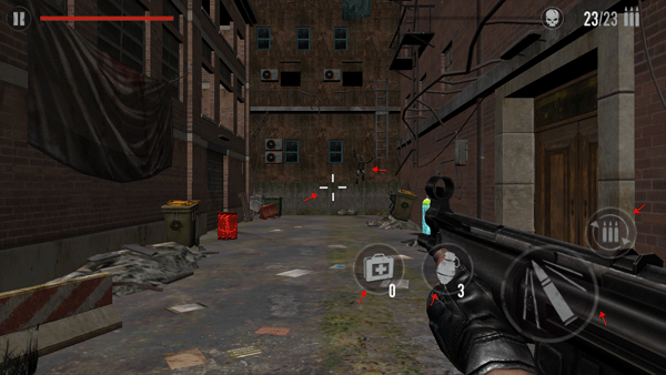 3、右边就是一些控制枪的按钮,右上角是填充子弹的按钮,下方是射击按钮,左边是医药箱和手榴弹,通过将枪左右移动的方式来将镜头瞄准,这样能打到丧尸。