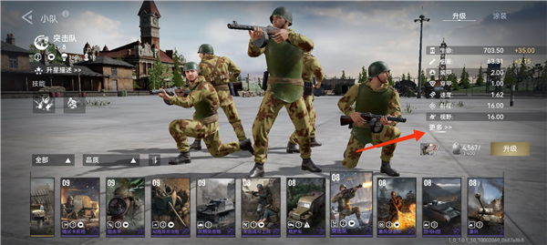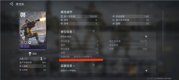 2、从兵卡详细界面了解,突击队由5单位构成,持5把波波沙冲锋枪,单发伤害5.6,如果突击兵被突击兵攻击那么他的单发承伤就是5.6-2=3.6,那么实际承伤3.6/5.6=0.64,拥有36%的伤害减免,而其他步兵被攻击则是(5.6-1)/5.6=0.82,只有18%的伤害减免,所以游戏实际表现就是突击队和其他步兵对拼时要肉很多。
