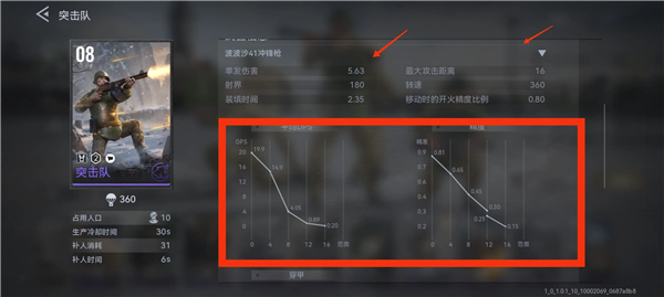 3、另一个比较重要的信息就是武器精度,突击兵移动开火精度0.8比多数步兵的0.5高一些,所以在同时移动中对拼,突击兵会占优势;精度折线图代表的意义大家应该都懂距离越远伤害越低,且所有步兵的武器精度都是距离为0越精确,伤害也越高,游戏实际表现就是挨着打很快能秒人,追杀逃兵半天打不死。这里的数据在对敌上有部分效果,因为不同兵卡的武器的精确度衰减不一样,如果能把握最佳对敌值,那么就能形成我打对方挺精确,对方打我不太精确的形势,可以拉开不同兵卡的输出差距,有微操的空间。