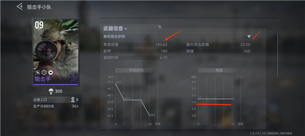 4、通过突击队的详细说明对比,我就简单介绍下狙击手,他的兵卡界面伤害35,这只能算他的综合输出能力,因为他只有一个兵员,实际输出我们可以看到详情界面武器春田狙击枪单发伤害184(大多步兵1单位只有140左右血量),精度为2不衰减,穿甲2,攻击范围22.5。