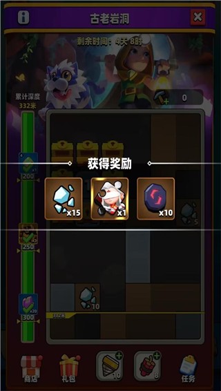 地层中掩藏着「珍贵矿石」宝箱区域,其中有多个奖励,点击宝箱获得神秘奖励吧!如果弓箭手遇见了调皮的「地鼠」一定不要错过,挖开它所在的格子,它们会向下逃窜,但是每次都会消耗掉它们一定的体力,当地鼠体力耗尽后我们便可获得丰厚的奖励!