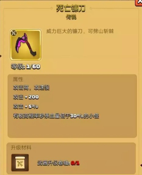 镰刀,暗黑大器,独特秒杀低血量怪物能力,攻击高但需巧妙使用。