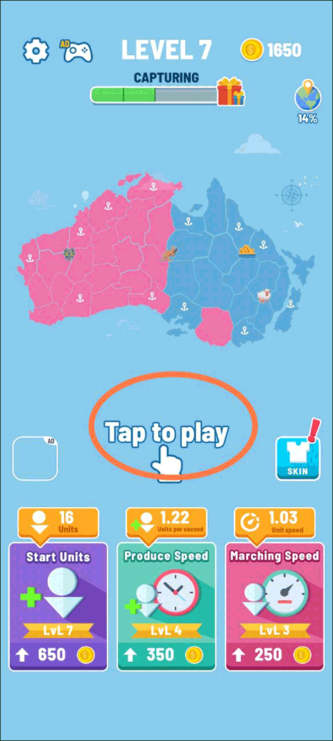 1、进入游戏后点击我们可以看见有一个很大的地图,屏幕中间有着一句话“tap to play”,点他就游戏开始了,它下面的3个分别是你的部队生成时间速度和数量,后续可以通过用金币升级的渠道加强这三项能力。