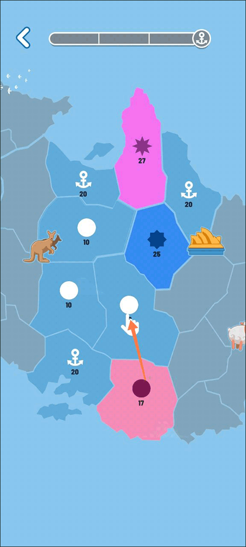 2、开始游戏后我们会有一块小岛屿,岛屿上的数字代表了这块岛屿有多少人,而我们要做的就是利用自己人数多的优势侵占其他岛屿,把这个地图都变为我们的岛屿就算我们胜利。而我们的岛屿之间也可以联动的方式去侵占。
