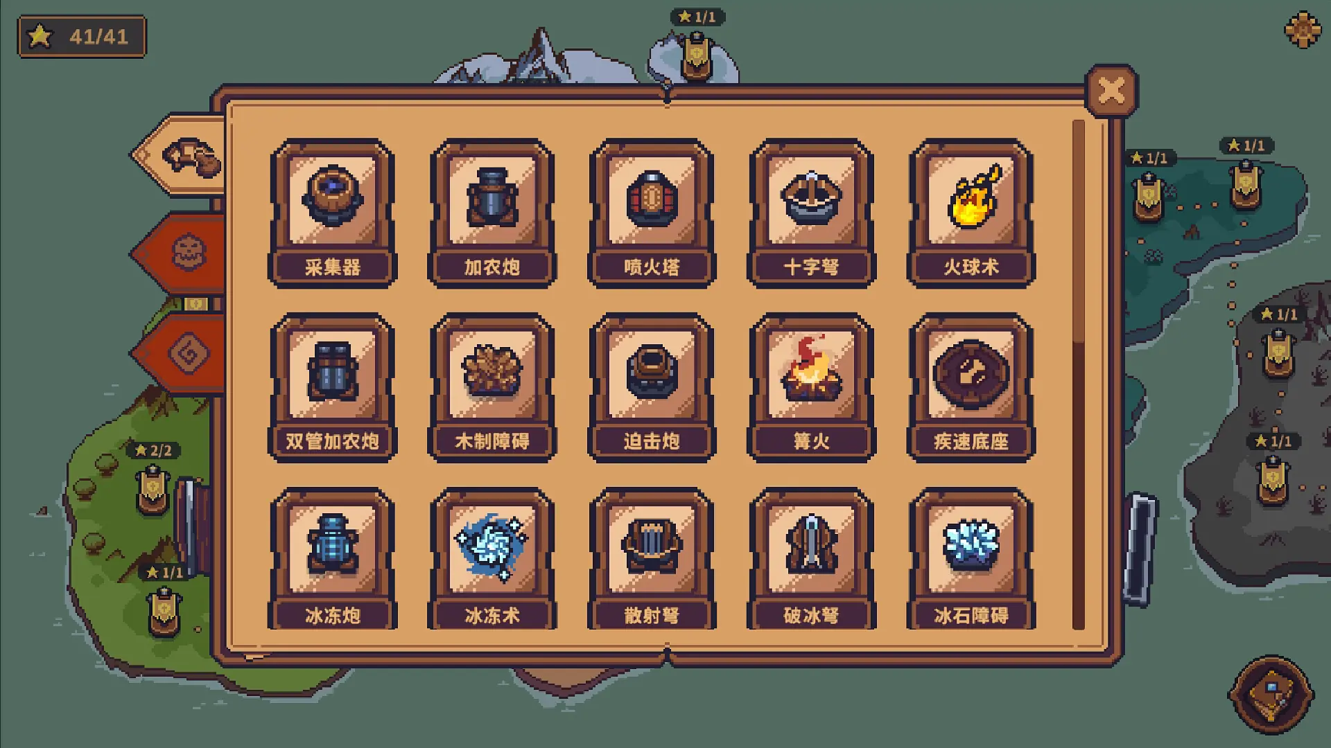 3、游戏共有5个大地图,每个地图都是不一样的地图环境,并且都有不一样的效果特性。比如冰雪地图,玩家必须建造篝火,否则温暖区外的建筑将进入冰冻状态,攻击和采集速度下降。沙漠地图则会让防御塔相邻升温,达到3级升温后攻击速度会加快,但同时受到的伤害也会增加,风险与收益并存。