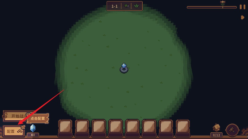 3、进入对局后,点击下方的配置选项,系统会让你挑选装备与防御装置。