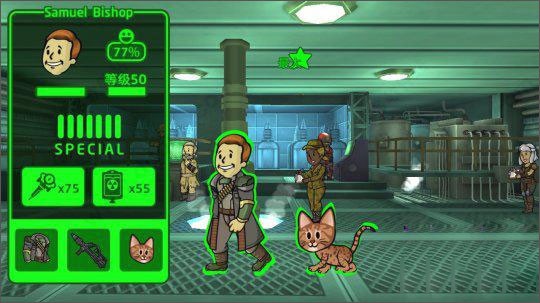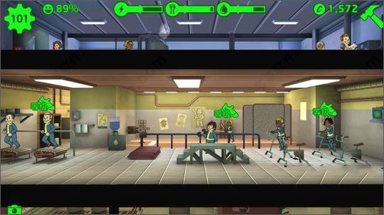 2、避难所运转起来之后,有人负责厨房(不要问哪里来的食物),也有人负责发电。至于你问到为什么没有看大门的?额,慢慢发展嘛。看到小编图中上面的标示了么,笑脸是满意度,数字是目前的人口数,其他则是电力、食物、水以及瓶盖。三样必需物资减少到了竖线位置后避难所的居民将会陷入恐慌,运转上容易出现问题,满意度也会下降。