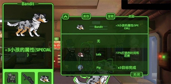 1、首先可以用金色宠物Bandit。它的作用是:如果居民想生baby的时候,带上Bandit生下的小孩7种属性:是S(力量)P(观察力)E(耐力)、C(魅力)、I(智力)A(敏捷)、L(幸运)都可以额外增加3点基础值。