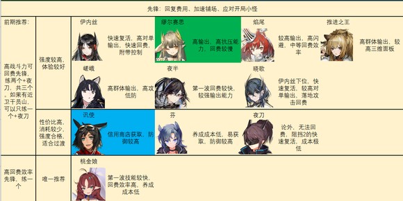 前期先锋练法如图:作为先锋用的需要练三个,两个高战斗力的+一个回费快的。如果有近卫干员山,也可以替换一个能打的先锋。除了这三个还建议练一个30级夜刀,可以当快速复活干员用,基建打工也很好。