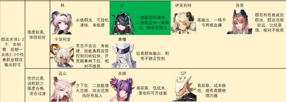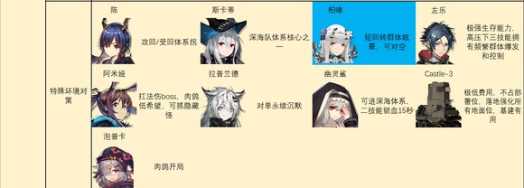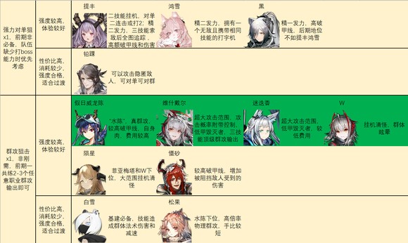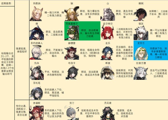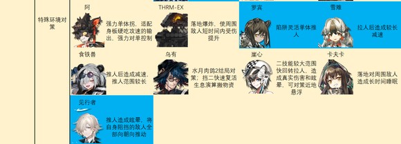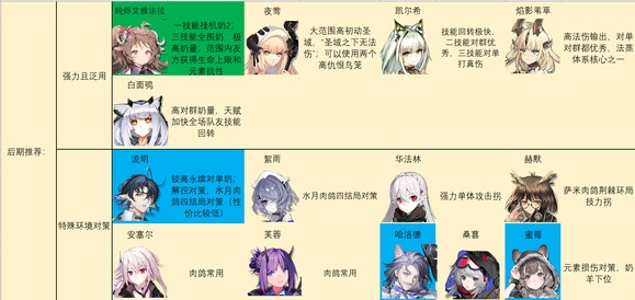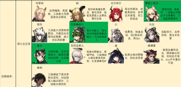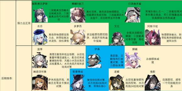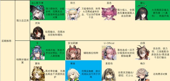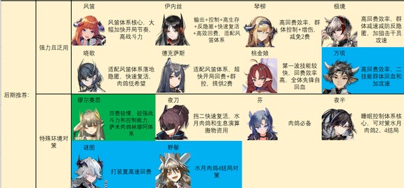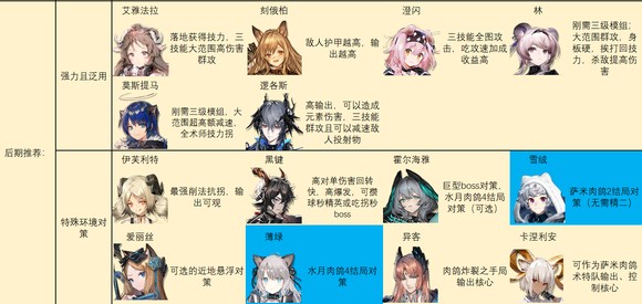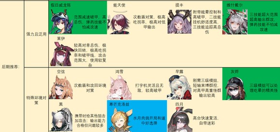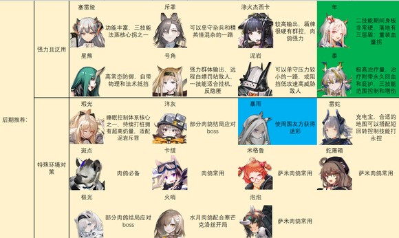 后期特种推荐如图。别怪我推荐的多,特种之间功能非常多变,几乎每个人身上都能抠出点优势区间……对于一般玩家来说,我建议练强力且泛用里的几个,加上温蒂,歌蕾蒂娅,老鲤,伊桑,阿,见行者/食铁兽二选一就足够了。