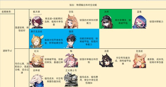 后期狙击推荐如图。速射手要不要精二一直有争议,我的建议是如果你没有其他可以高效对空的干员,那还是需要精二一个的,可以从六星速射手和寒芒克洛丝里挑,后期速射手不精二本职工作都做不好,精一过渡等其他强力对空并不合适,因为精一不够过渡用。
