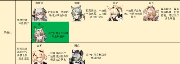 后期医疗推荐:后期环境是低压不用奶、高压奶不住的环境,因此医疗比起治疗量,更看重功能性。所以一些功能性不太强的医疗就慢慢退出舞台了。闪灵其实也可以练,不在推荐中是因为加防的功能性给的幅度略低,高难图用处有限,但日常推图效果还是很明显的。流明的解控能力实际不算好用,只适合应对控制不是很频繁,且控制效果附带伤害的敌人。