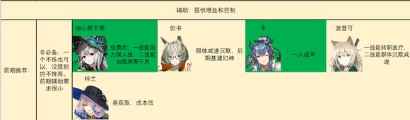 前期辅助练法:不练都可以,前期环境很简单,基本都是堆输出、奶和重装就能打的,一般带辅助不如多带个别的。如果有令,可以练起来带队,在前期地图中如果有个精二令,基本就不需要练任何先锋之外的地面位了。