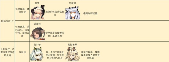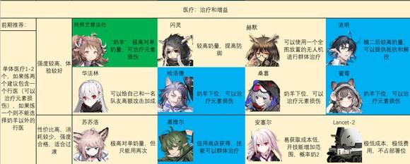 医疗干员主要用于为范围内的其他干员回血,和给予部分增益buff。医疗可以大致分为单体医疗、群体医疗和输出。