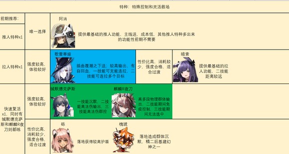 前期特种练法:推拉特种各一个+一个快速复活必备。对于输出特种,如果有艾拉必练,水月和阿斯卡纶也比较推荐,一技能清怪在日常图相当不错。琳琅诗怀雅和多萝西属于在前期数值够用,但也有明显缺陷的干员(主要是吃费用和操作),没有其他强力六星选择时才推荐练。