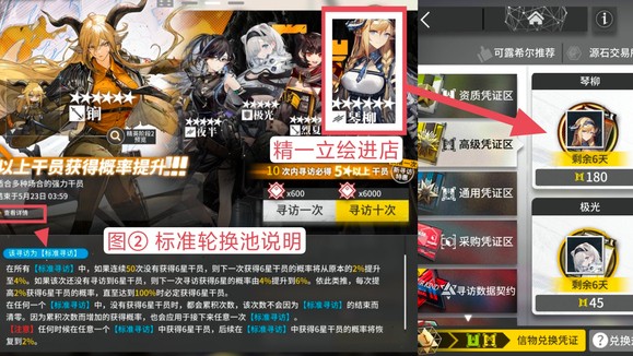 标准寻访进店角色通常为精一立绘且站位较偏,以当前标准池为例,锏与琴柳两名六星,进店角色为琴柳(见图②)