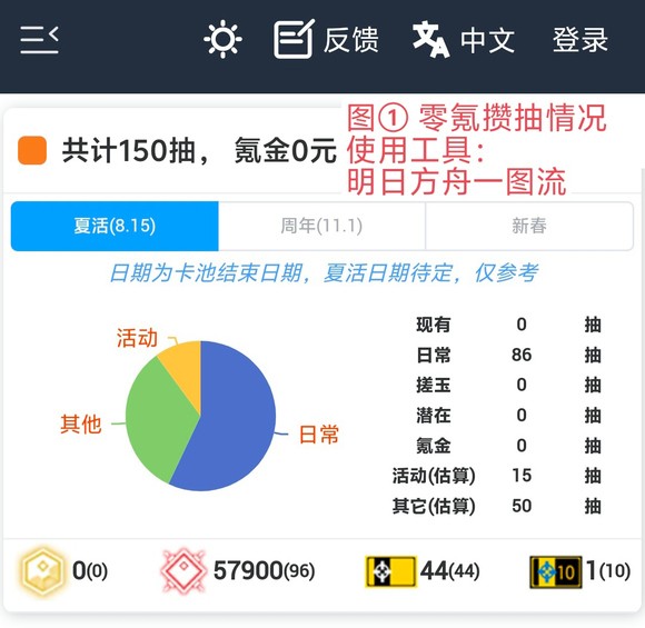 抽卡:以明日方舟一图流为参考,不计入氪金资源,不使用源石抽卡,如果仅抽取限定池,以当前至夏活结束为例,共150抽(见图①,添加了三个复刻活动的9抽)。按卡池概率,六星为(全部计为新获得)3票,五星为(6当期up+6歪,歪出按新获得计)32票,四星为(五成按满潜计)37.5票,即零氪三个月可在限定池获得约72.5票,考虑到日常up池抽卡需要,年化–10%约为261票(此段仅个人体感,由于入坑后干员获取情况不同,误差较大)