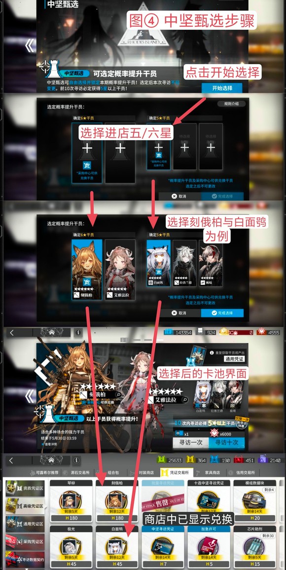 中坚寻访中会直接写明可兑换角色(见图③),但存在一种额外情况:⭐中坚甄选⭐(即当前中坚卡池),可从12名六星干员、24名五星干员中自主选择进入卡池。也就意味着[可以自己选择进店角色],这也是前文不推荐抽取中坚卡池的原因,可以说中坚本就不是用来抽的,而是用来换的(详细步骤说明见图④)