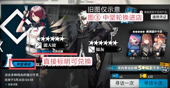 同样为14天一换,与标准轮换池岔开7天。每五次普通中坚轮换后会出现一次中坚甄选,中坚轮换的规律大致同标准轮换老角色规律(即进店者在距今进店最远、日数相近的三名角色中选出)当前日数可见图⑦
