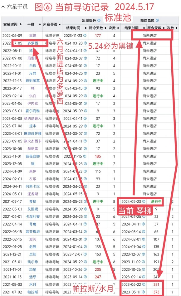 以本层图⑥表中为例:当前池进店为琴柳,则5月23日本池结束后,下一个必定为黑键;再下一次高概率为帕拉斯或水月,后续又必为多萝西。老角色进店规律不绝对,一般在距今进店最远、日数相近的数名角色中选出(可关注b站罗德岛蜜饼工坊的轮换预测)