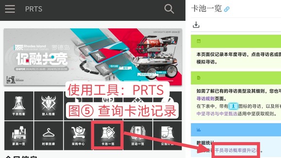 ⭐卡池轮换规律⭐:仅对进店规律进行推测,结论不绝对。使用prts数据进行说明(自行查询步骤见图⑤)。