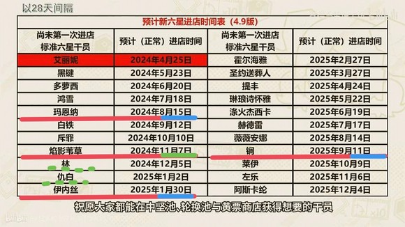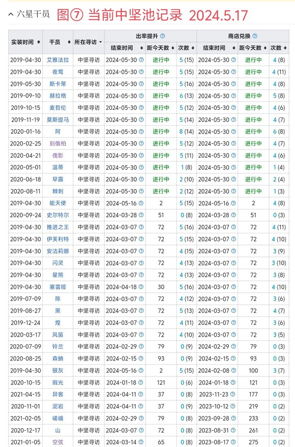 由于中坚甄选的存在,中坚池规律不进行更加详细的解说,仅靠排名大致预测即可(当前中坚池内共33人,每三个月一次甄选,单次可选12人,加上甄选之间还有五个中坚轮换,⭐可以认为所有中坚角色九个月内必然进店⭐