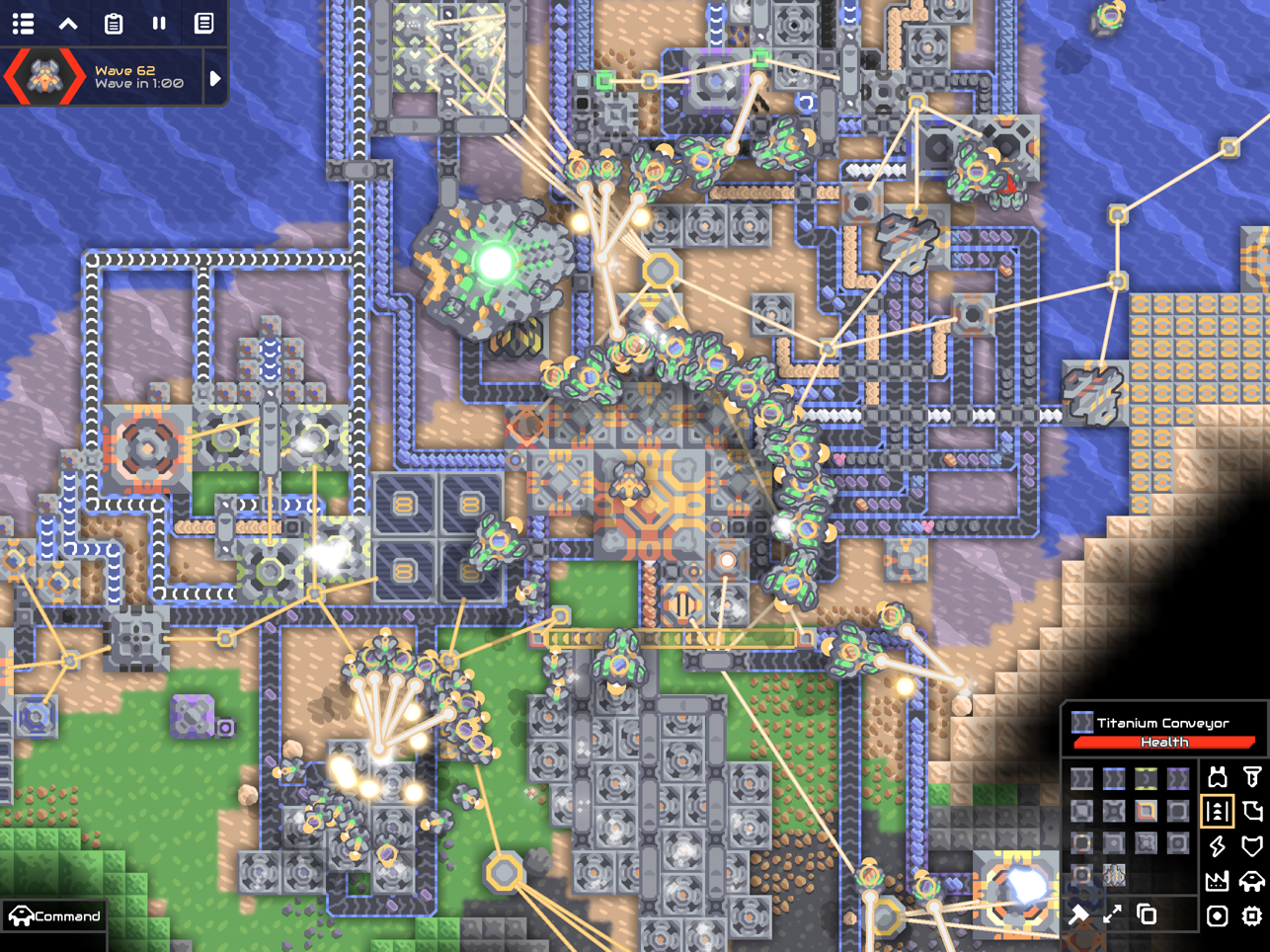 到了之后完全不用考虑生产,先绕地图一圈找刷怪点,然后看看是堵上刷怪点容易还是堵上家容易,选一个堵;有好几条路就都堵上,然后选一条造塔,注意这条路的墙应该是最 !薄!的(以防怪去其他路)塔:推荐齐射炮配钍弹药,钍直接从核心用一个装卸器拉出来直接拉到塔附近,记得多造点塔;核心能带超过7k的钍,看起来根本用不完。修复器(修墙用的,建议多造几个)供电:同样从核心拉煤出来烧,附近有水就涡轮,否则火力,然后电拉到塔旁边