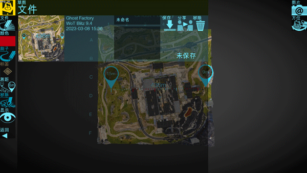 绘制就是当中间的地图通过刷子颜色、测距、显示等工具绘制一份草图。地图弄好之后就可以保存在本地。