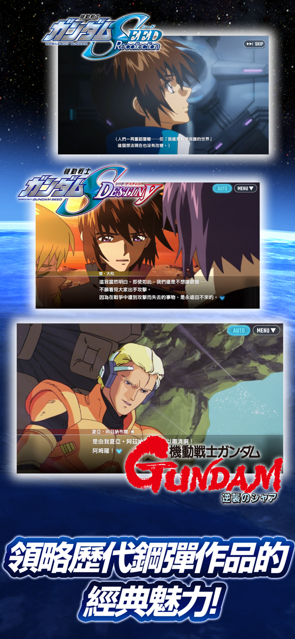 可通过开发获得超过 300种机动战士。升级和培养你最喜欢的 MS 和角色,组建独特的小队,带领他们走向胜利!准备好与你的梦想战队称霸战场。