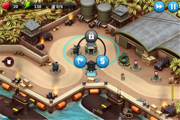 卫兵塔在关卡中起到抵挡伤害放置敌人前进的作用,让机枪和大炮可以尽可能多些输出,但还有个作用就是配合大兵;只有大兵击杀敌人后会获得金币,但自身血量成长并不是很高,尤其前期很容易被敌人击杀,所以我们把大兵放置在卫兵后面,根据地图上敌人聚集多的地方,把大兵调过去,这样可以多获得金币