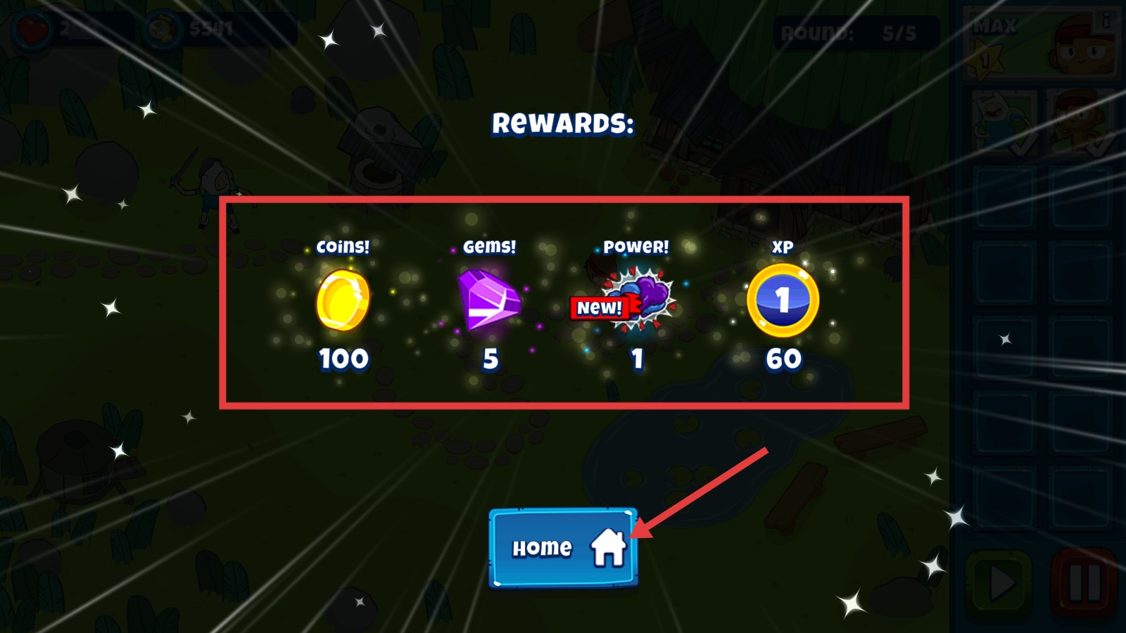 4、完成关卡后,领取奖励并点击【Home】返回主页。