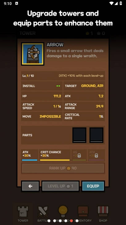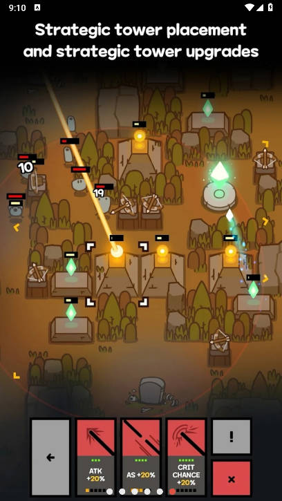 2、升级系统:玩家可以通过积累游戏中的金币或经验来升级防御塔,提高其攻击力、攻击范围、施法速度等属性,更好地应对敌人的挑战。