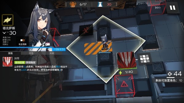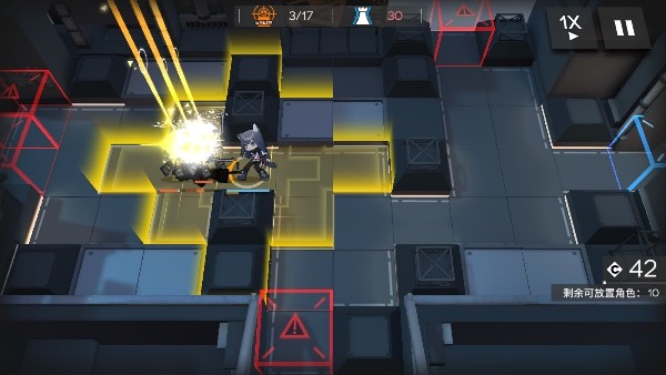 3、游戏任务是守护蓝色框中的还未苏醒的博士,你需要部署干员来稳固阵线,界面上方分别显示的是敌方被杀的数量以及敌方的总数,点击右上角的播放按钮可暂停游戏,点击1X可加速游戏。