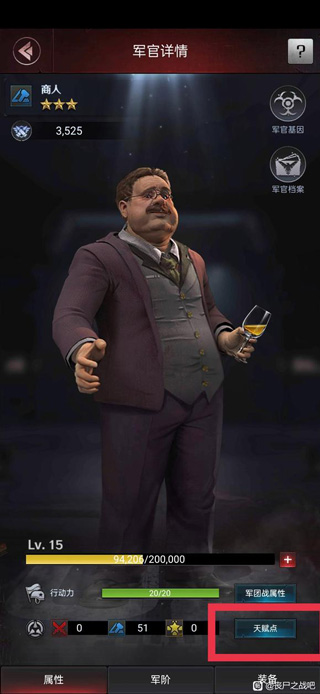 然后说一下军官天赋点的点法。一定要驻扎到对的位置。商人。机械师。教官。的话前边已经讲过了。300卡片解锁就好。不需要多。商人的天赋点主点发展。前期点油。铁。合金采集。一直往下点就好。机械师是辅助。主点攻打潜伏者行军速度和体力回复速度。由于没有第二选项所以一直往下点。教官的也是辅助。一直往下点。全部偏左。