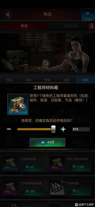 上述条件达成后。买了一个周卡。有了十来万钻石首先把钻石转盘点够9次。然后点背包点商城找到工程师材料箱。买1000个拉到底。然后找到工程师稀有材料箱。买50个。回背包开。合两个紫色材料汽油。不要买3000钻石开1—3的。然后到背包里点工程师材料箱全部使用。然后到建筑军械库。合工程师装备的第一个扳手。点制造。点材料合成。点绿色的全合蓝色的。然后再点蓝色的合紫色的。再紫色合金。那个汽油要两个紫色。两个紫色加两个金色几率一个47%一个53%。去赌。活动里黑钻商城买12万聚变核心。然后点制造。用通用加速秒时间。赌出来后。是紫色的话点这个装备分解继续反复操作。直到出金为止。然后是秒表和工具箱。这三个必须出金完成后。花钻石买300科学家卡。给科学家穿上。并且驻扎到科研馆。