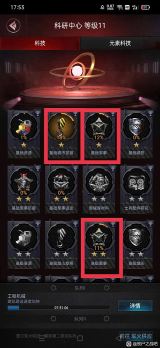 萌新和零氪。大佬。钻石攒起来或者花了继续攒。现在要花钻石秒科学家军官卡升到技能3。记得屯资源。如图:把第三个点出来开始升级科技。点科学家技能『节能』点击使用。主点打怪速度。和体力恢复。然后把科技点穿。点出两个出征军团数量。[注意技能只有5分钟。冷却48小时]如下图所示。需要点的是画圈的科技。画圈里边的画圈全部升满。